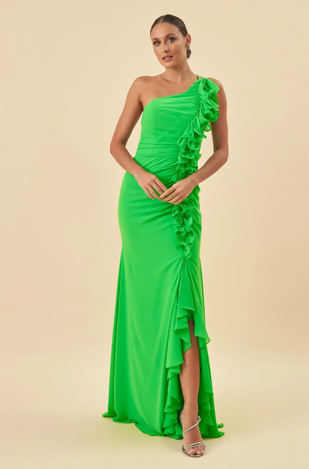 - Babado aplicado começando dos ombros e descendo até a fenda;