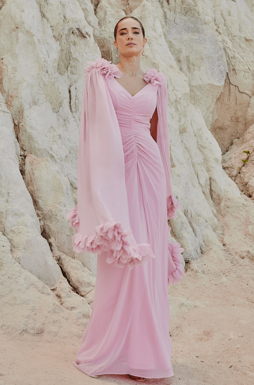 vestido longo com flores, vestido de chiffon romântico, vestido com manga capa removível, vestido madrinha delicado, vestido de festa com decote V, vestido Garden Brand Berenice, vestido floral artesanal, vestido elegante e fluido.