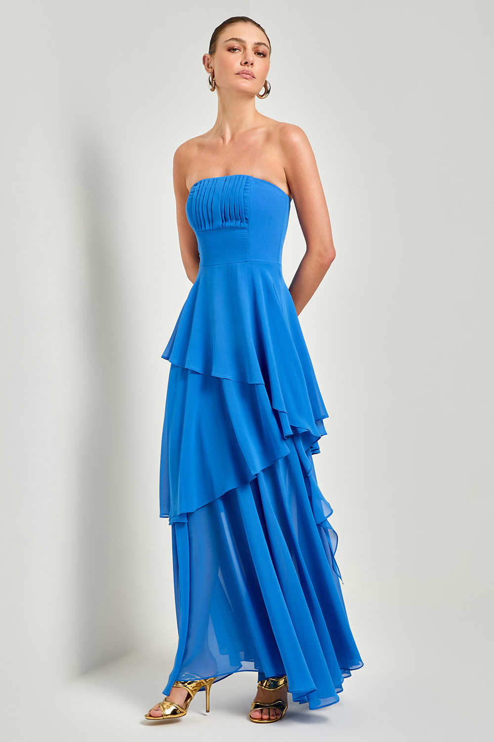 Vestido Longo Brena é confeccionado em tecido de chiffon, proporcionando um caimento leve e fluido. O design com decote sem alça destaca os ombros e o colo, enquanto o corpete ajustado com detalhes drapeados realça a silhueta de forma elegante. A saia em camadas assimétricas adiciona movimento e um toque romântico à peça. Ideal para eventos formais ou celebrações especiais, este vestido oferece um visual sofisticado e encantador. A combinação do chiffon e das camadas fluidas faz desse vestido uma escolha perfeita para quem deseja destacar-se com elegância e graça.