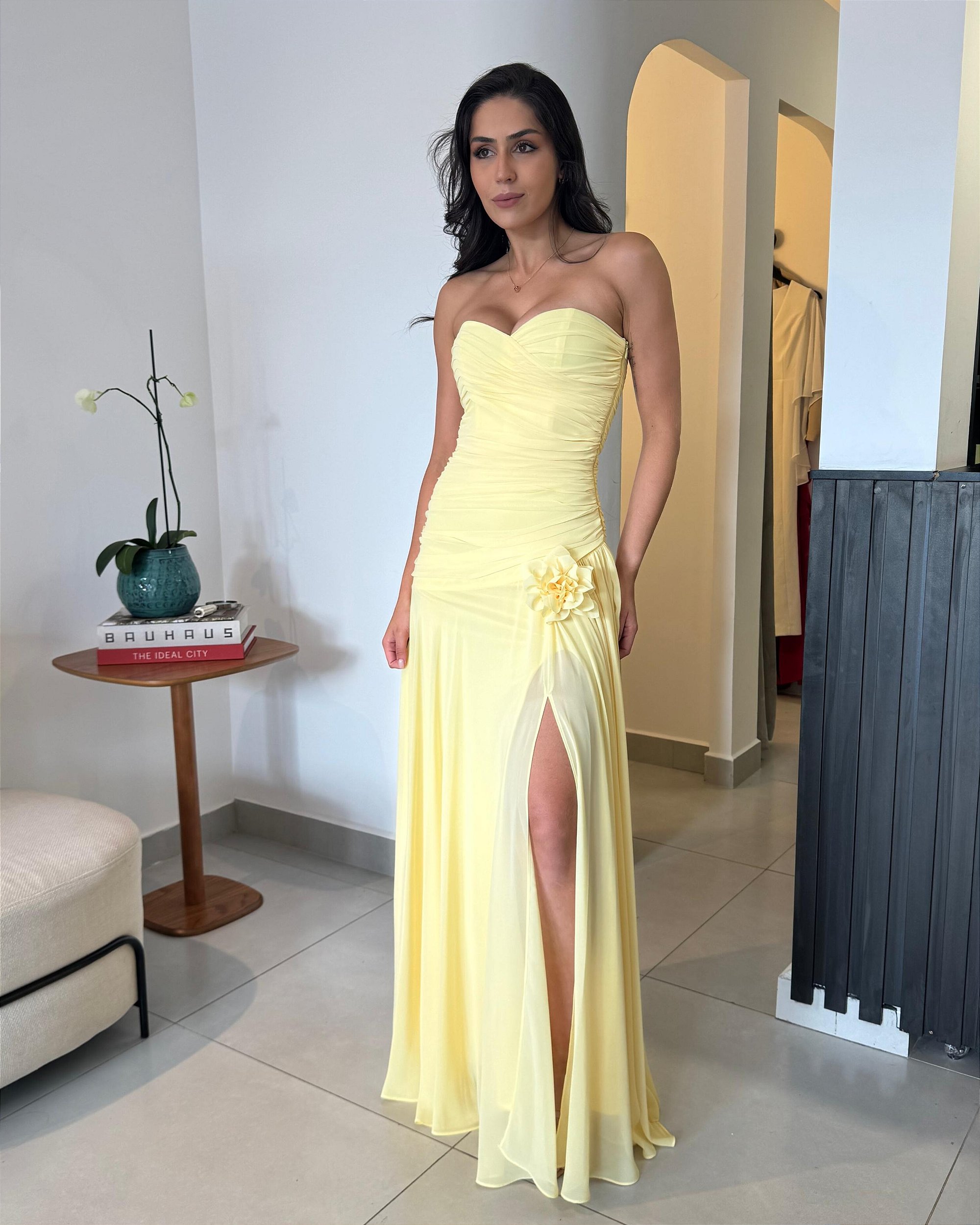 O busto apresenta decote tomara que caia transpassado e franzido, valorizando o colo de forma refinada e oferecendo excelente sustentação. A cintura com recorte diagonal cria um efeito que alonga e afina a silhueta naturalmente.