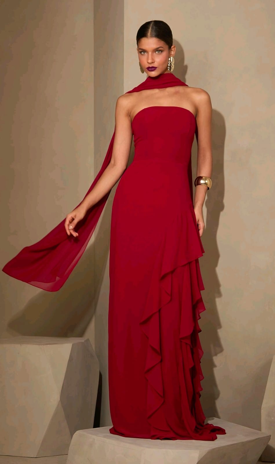 Use o Vestido Isadora com brincos marcantes e cabelo preso para valorizar o colo. A echarpe pode ser usada solta para um efeito dramático ou ajustada ao pescoço para uma proposta moderna e sofisticada.