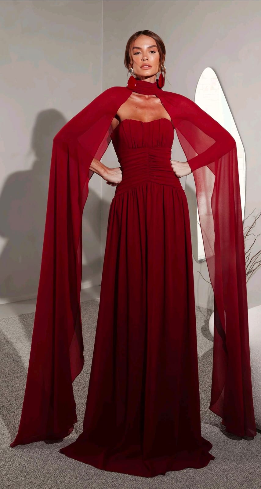 O busto tomara que caia com leve drapeado valoriza o colo com delicadeza, enquanto a cintura marcada modela a silhueta de forma elegante. O grande destaque está na capa removível, que transforma completamente o visual — trazendo imponência e movimento para ocasiões mais formais, ou um look mais clean e versátil sem a capa.