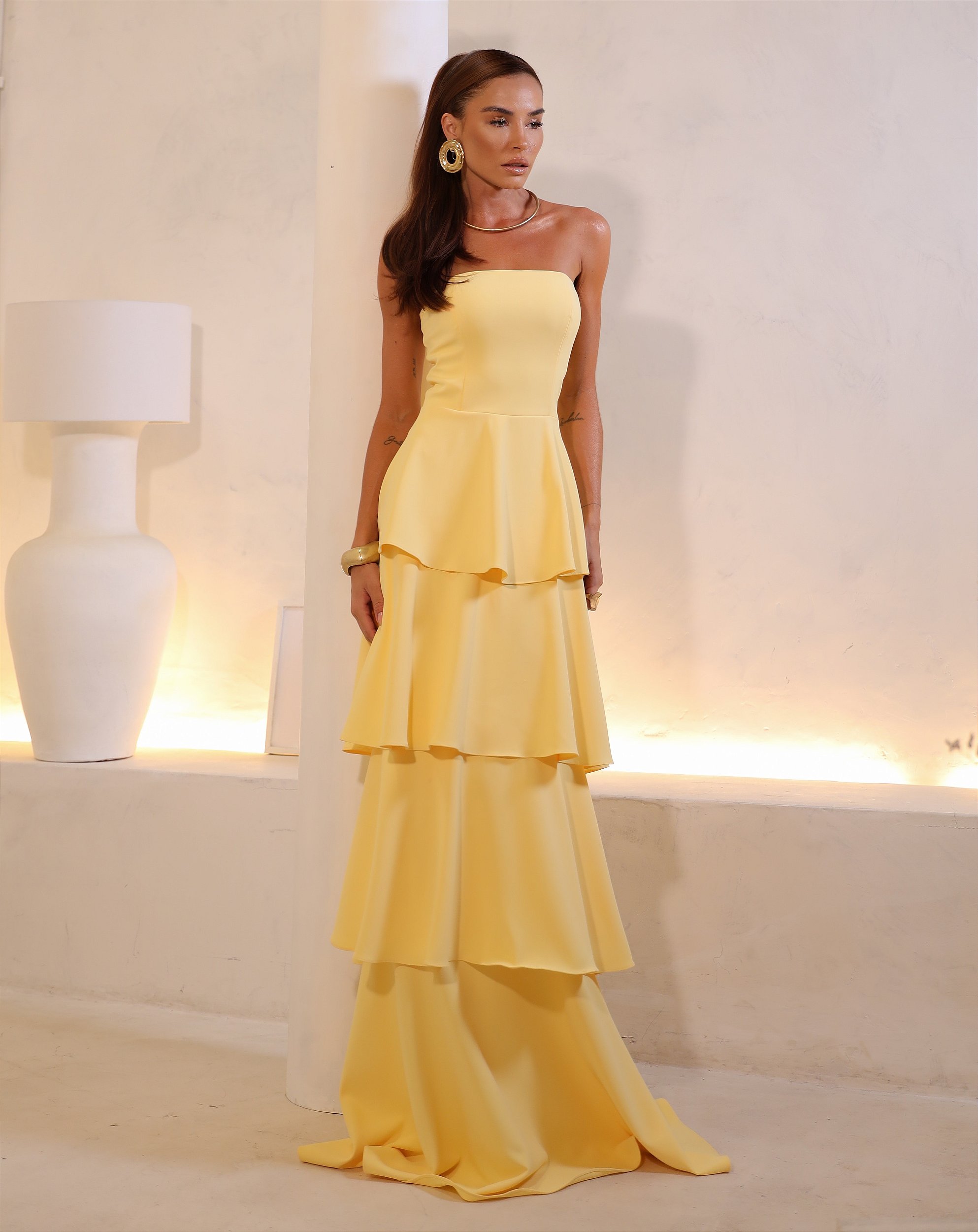O Vestido Luna traduz elegância contemporânea com acabamento impecável. Confeccionado em crepe premium, possui busto tomara que caia estruturado e saia em camadas amplas que criam volume equilibrado e movimento sofisticado. Um modelo que une presença marcante e refinamento minimalista.