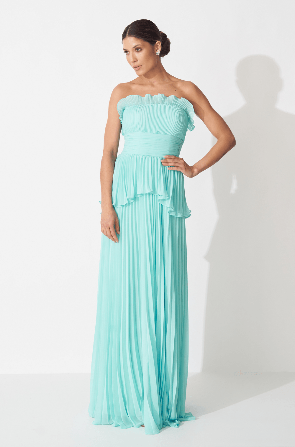 Vestido longo em chiffon plissado, perfeito para eventos em que elegância e movimento andam juntos. O decote sem alças possui detalhe de babado plissado que traz leveza à região do busto. A cintura recebe um detalhe horizontal plissado e um peplum assimétrico, mais curto na frente e com caimento suave nas costas. Acompanha cinto removível com alça bold e ponteira de flor tipo copo de leite, que adiciona um toque fashion e romântico. Saia longa e fluida com plissado contínuo que garante movimento. Zíper invisível nas costas. Ideal para casamentos ao entardecer ou festas com dress code sofisticado.