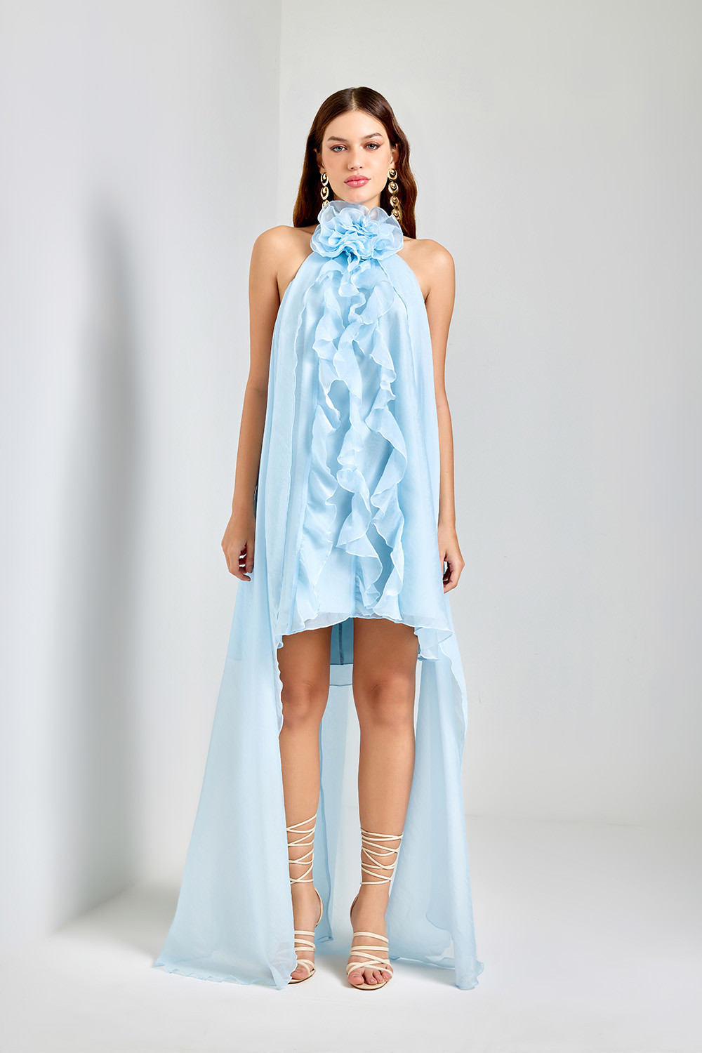 Na parte frontal, a gola alta com amarração é enfeitada por uma flor fixa e volumosa que centraliza o olhar e reforça a originalidade da peça. Babados delicados percorrem o centro do vestido em cascata, criando movimento a cada passo. A modelagem mullet com cauda leve e costas abertas garante um caimento fluido, elegante e ousado na medida certa.